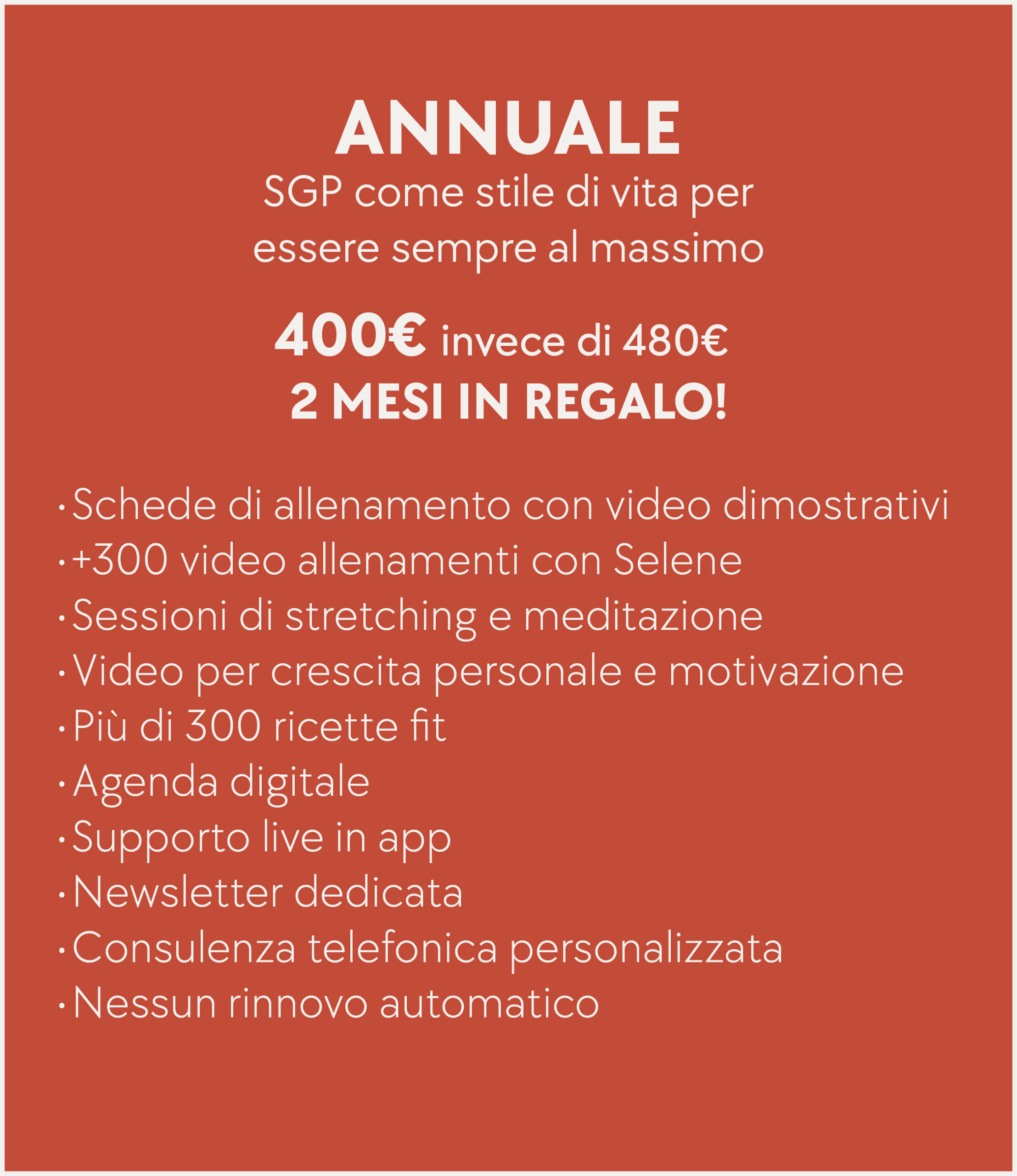 All’interno di SGP puoi scegliere liberamente l’allenamento che preferisci in quel momento: una scheda o un video workout. Sono tutti completi, total body e pensati per lavorare il corpo in modo armonico.